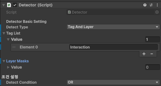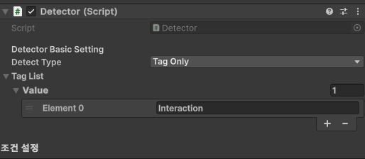 - 위와같이 에디터상에서도 DetectType에따라 List나 조건관련 변수가 보이고, 보이지 않게끔조정이 되어, 해당 타입에 필요한 변수들만 띄워주는 것을 볼 수 있다.