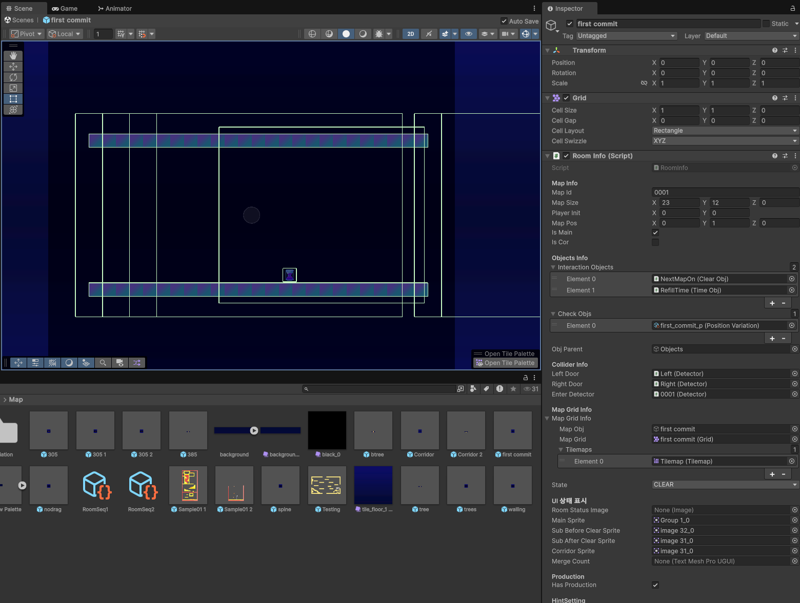 또한 다른오브젝트에 카메라 연출, fade같은 스크립트가 나뉘어져 있고, roominfo class에 등록되어있지 않아 roominfo가 초기화되어 맵이 다시 쓰여지더라도, 아래 오브젝트들은 초기화되지 않는 이슈가 있다.