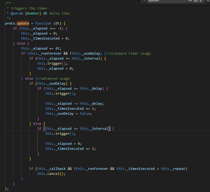 shcedule의 경우 CCScheduler.js 에서 interval관련 함수부분에서 다음과 같이, delta time을 이용하여 추가해주는 것을 확인 할 수 있었다.