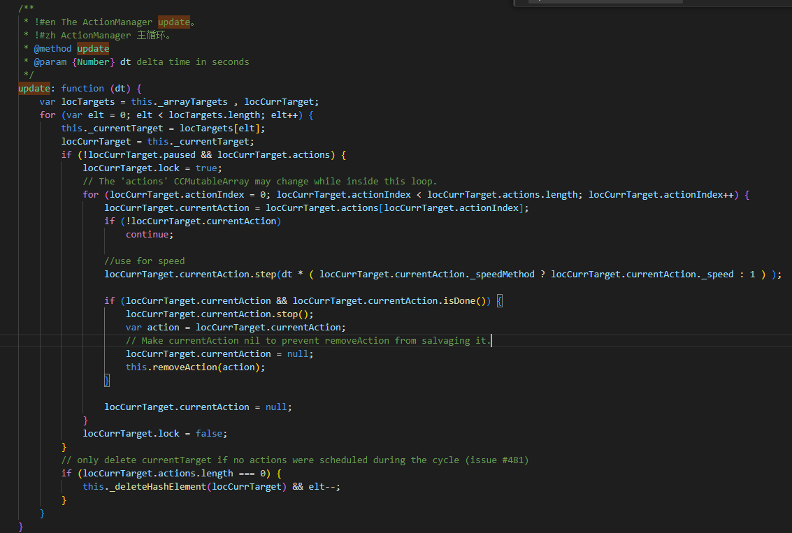 tween의 경우, 2.x 버전에서는 action class 를 wrapping해서 사용하였으므로, CCActionManager.js 에서 update부분을 확인해줄 수 있다.